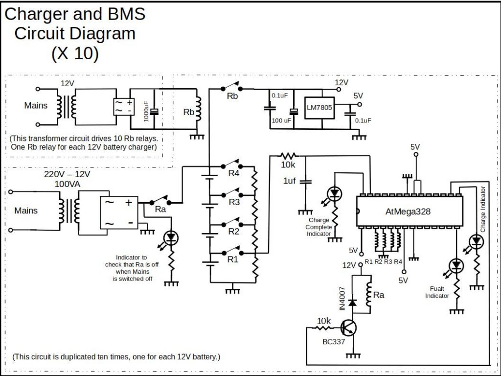 The LFP (Lithium) Battery Charger with integrated Battery Monitoring System (BMS) is designed to charge a 12V battery consisting of four LFP cells to about 90% full. (3.5V per cell). The EV battery is made up of 10 x 12V batteries in series (40 x LFP cells.). Ten of these battery chargers are used to charge the ten 12V batteries.