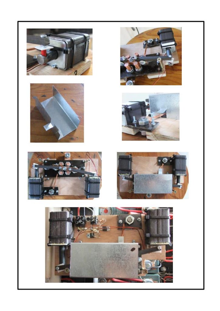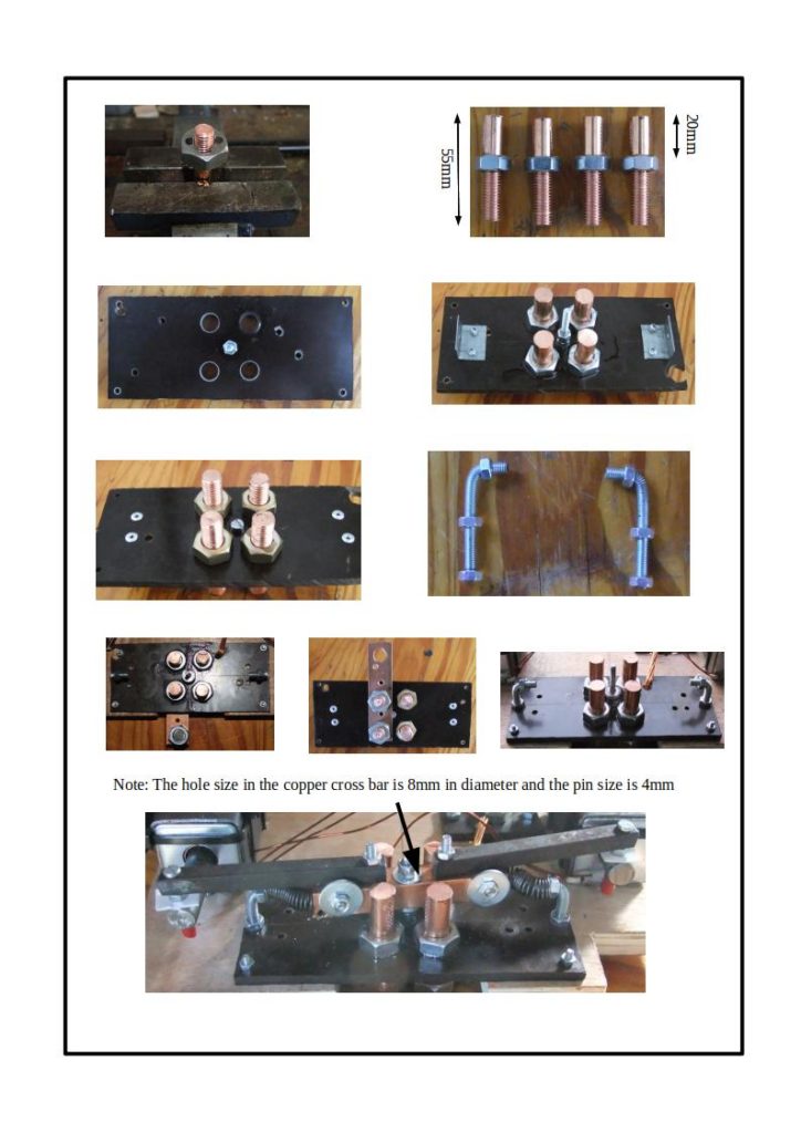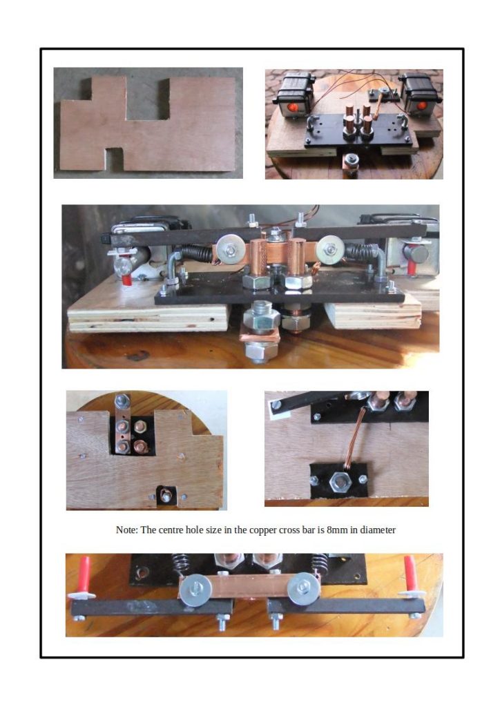 The Copper Cross Bar hinges around a centre pin (50 mm x 4mm screw). The hole in the centre of the cross bar size is 8mm in diameter to allow for sufficient tolerance. (wear and tear of copper contacts). Two solenoid arms are attached to the cross bar via hinges (30mm x 4mm screws). These arms hinges with the solenoid plungers by means of electrically isolated pins. (30mm x 4mm screws). The construction of the switch is shown in the following pictures: