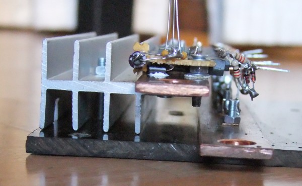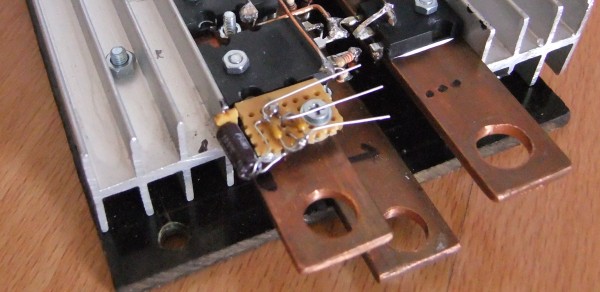 The temperature sensor is based on the LM35 Temperature IC. The IC is soldered onto a small piece of veroboard together with its de-coupling capacitors. This small temperature module is then fastened to the MOSFET heatsink and the the sensor leads are connected to the PWM Micro Processor as shown in the controller circuit diagrams. The location of the temperature sensor is shown in the pictures below: