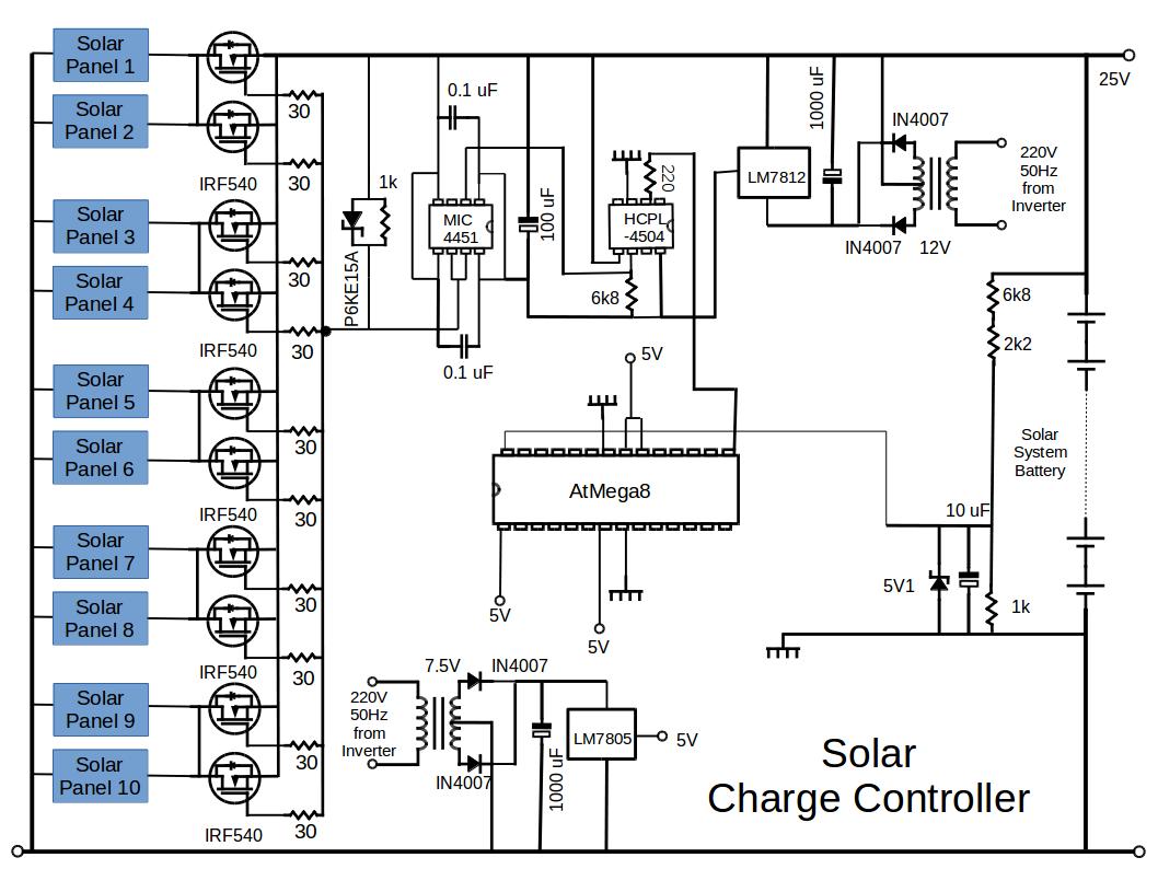 The circuit diagram of the solar panel system charge controller is shown in the figure: